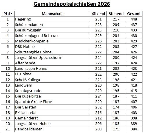 Gestern am 07.03.2026 fand unser alljährliches Gemeindepokalschießen statt. In diesem Jahr haben 21 Mannschaften teilgenommen. Von den Mannschaften hat sich mit 448 Ring der Hegering an die Spitze gesetzt, dicht gefolgt von den Schützendamen mit 437 Ring und den Rumkugeln mit 433 Ring.